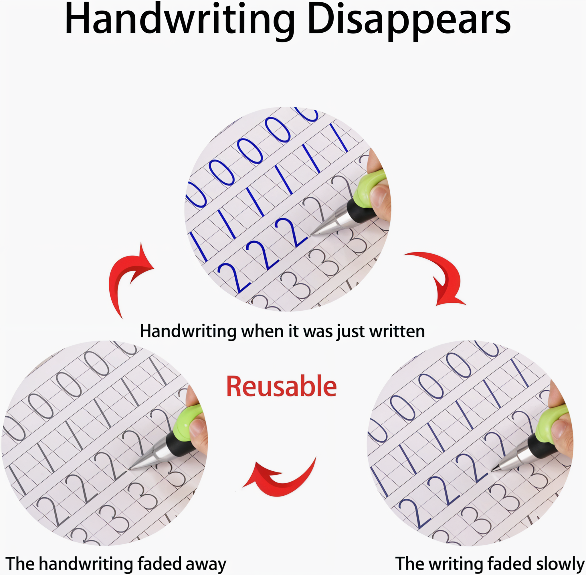 Copybook has a Four-dimensional groove design, use the automatic fading pen to follow paths and draw different shapes. With these automatic fading pens the text on the book can fade out automatically after 10 minutes, which means kids can apply the magic practice calligraphy for many times.